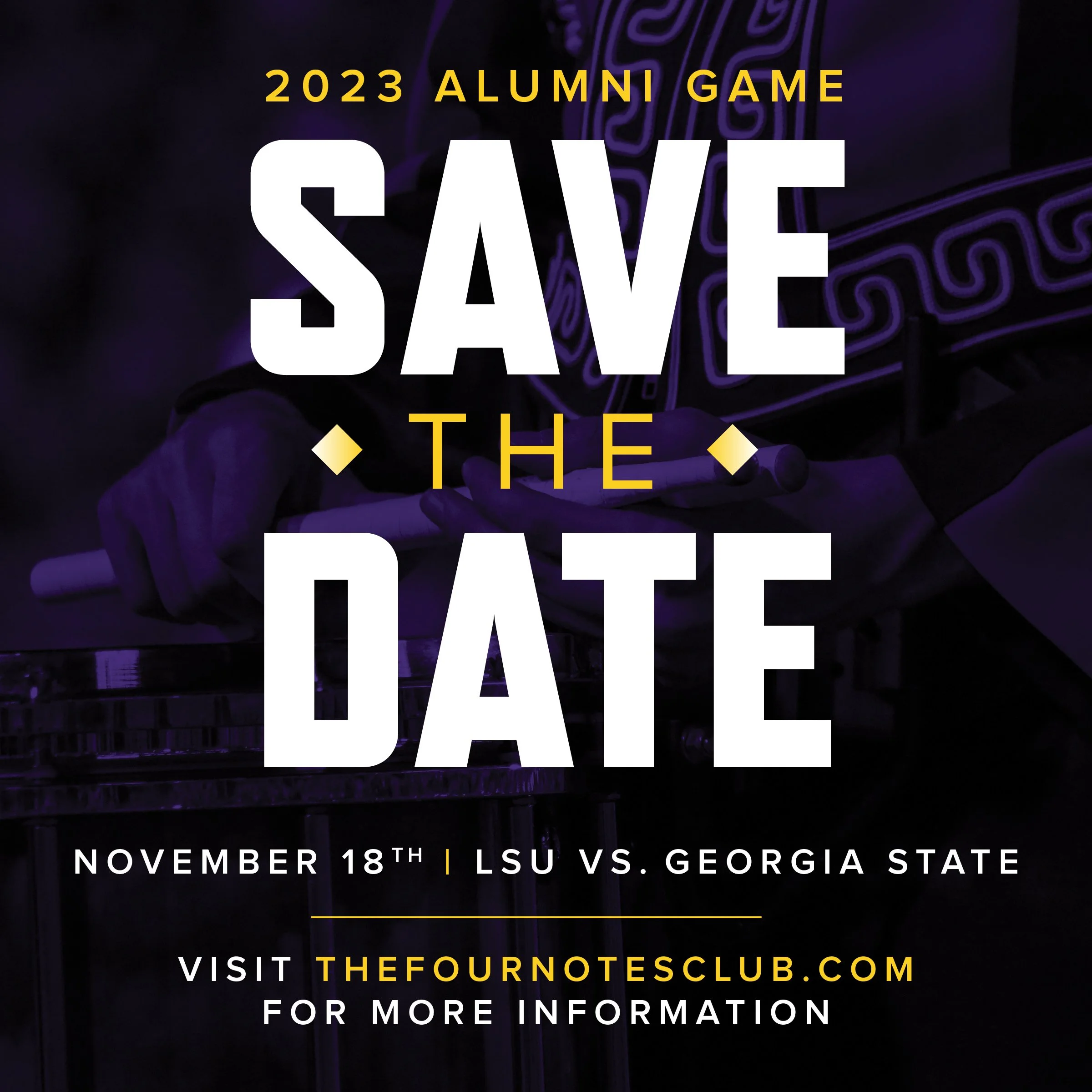 The 2023 Alumni Band Weekend will be held November 17-18 at the LSU vs Georgia State game. Registration opens October 1st. Click here for more information. Active Four Notes Members will be eligible for discount on their Alumni Band Weekend Package! We are looking forward to a great weekend celebrating the 130th Anniversary of The Golden Band from Tigerland.
